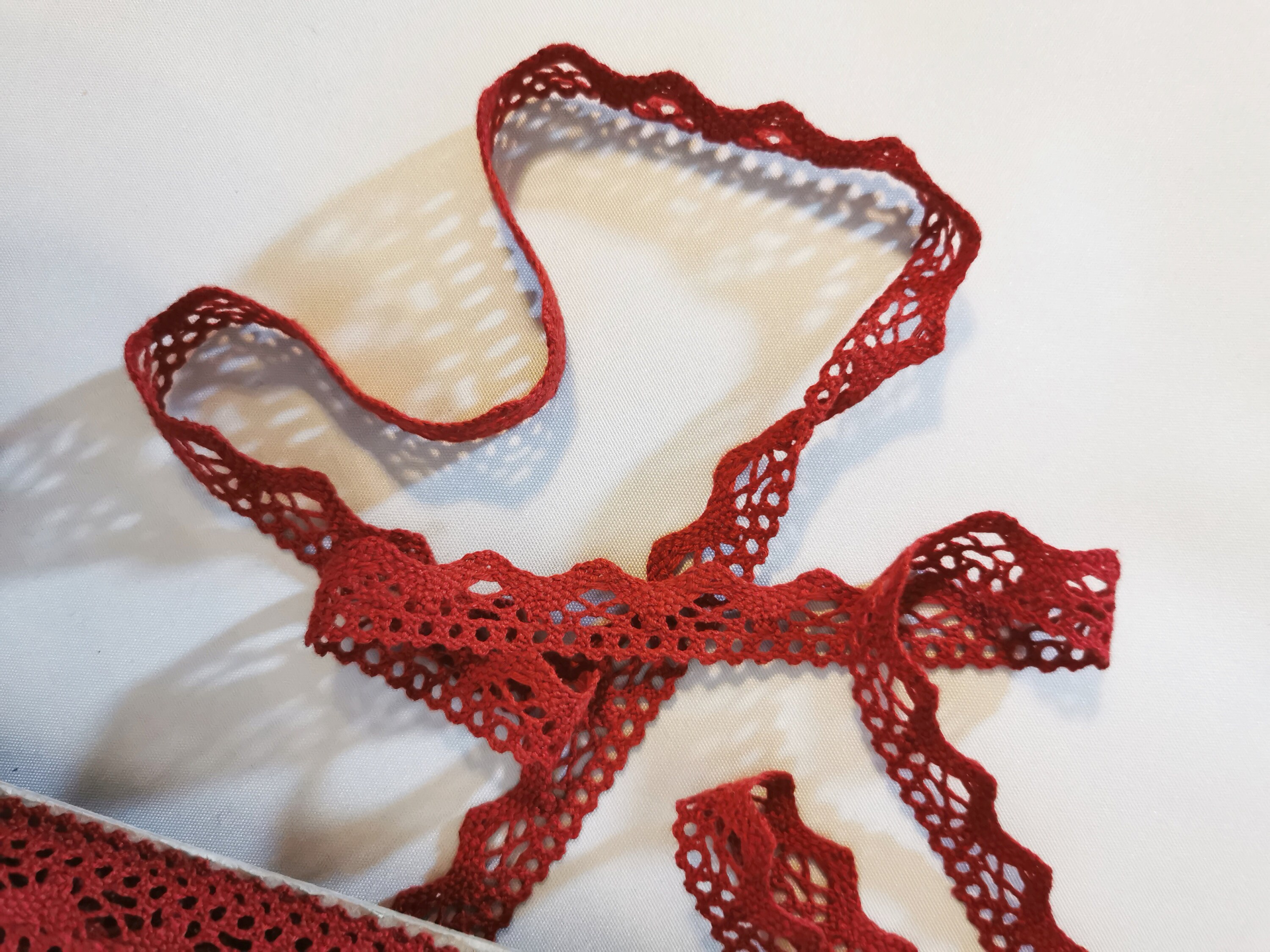 Fine bobbin lace made from naturally dyed (blue, black, green, red) or undyed, unbleached (white) organic cotton. Width approx. 19 mm.